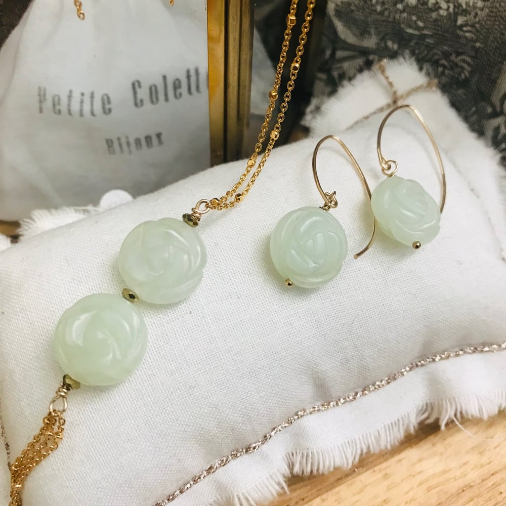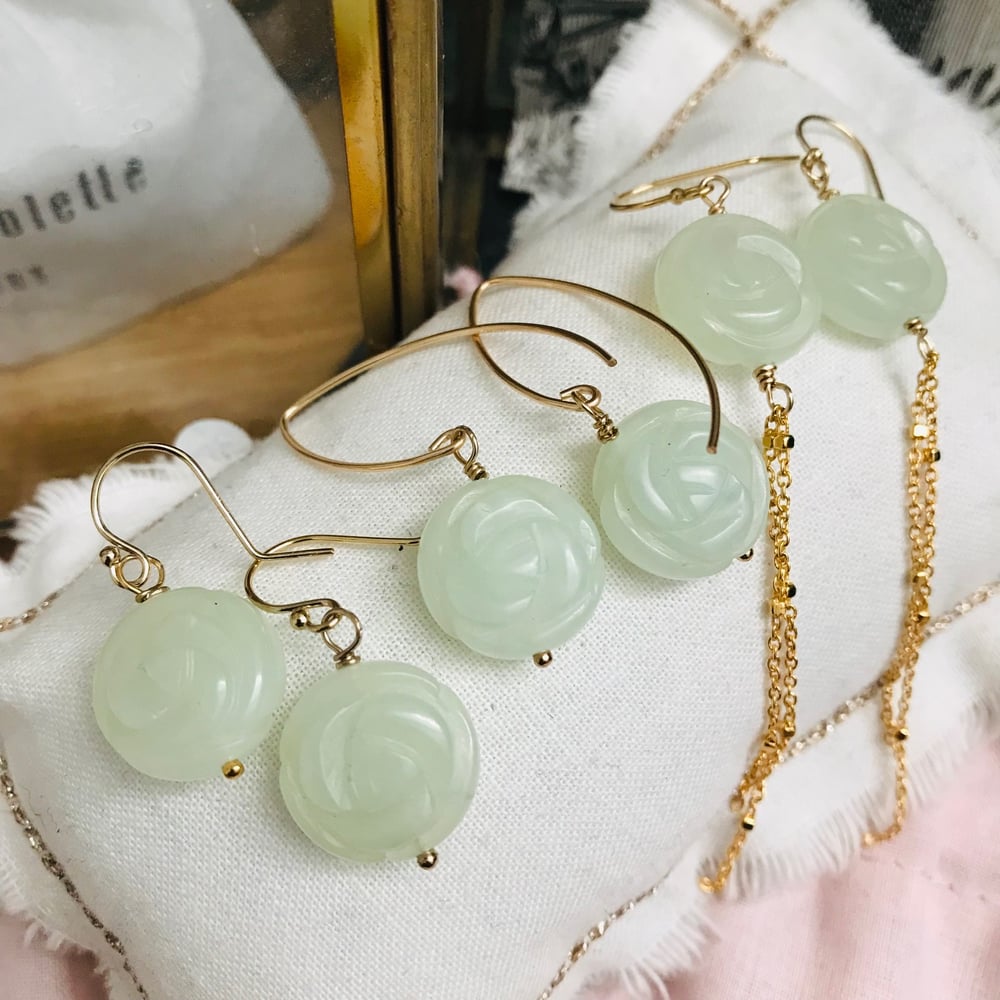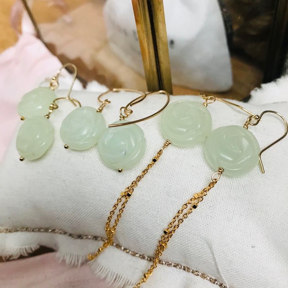 Boucles d'oreilles avec des perles en serpentine sculptés en forme de roses.